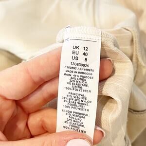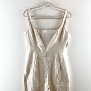cream, off white, linen blend, square neckline, tailored suit look, one piece, flare leg, stretch, back zip, jumpsuit, sleeveless, pinstriped