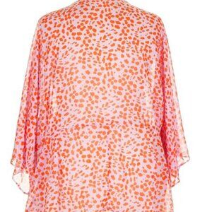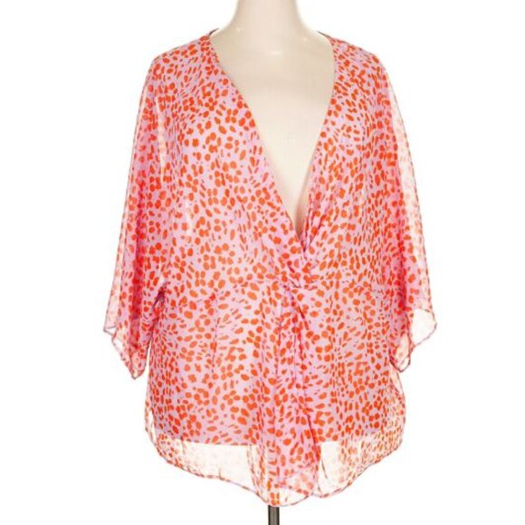 100% polyester 3/4 kimono-style sleeves, plunge/surplice neckline, pink with orange dots 33" length (approx.)