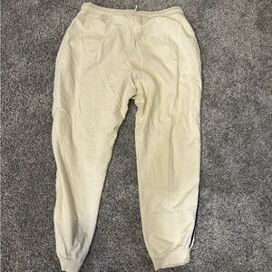 Cream with black stripe down. Great travel outfit. Size 14 shirt and pants. Jogger style pants.