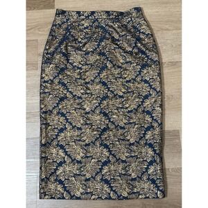 ASOS Tall Gold Floral Jacquard Skirt Navy Blue Midi Pencil US 12 Holiday Party