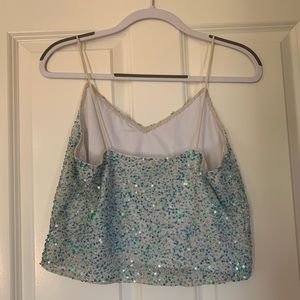 Light blue beautiful cropped tank top with sequins, embellished beads, and sparkles. Great for a party look or a night out. Still in good condition.