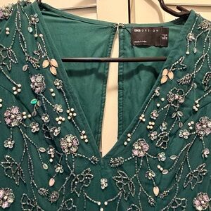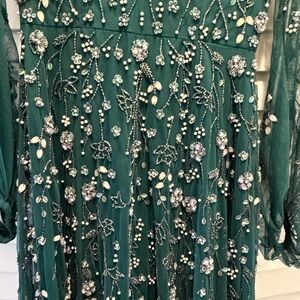 Elegant teal maxi dress. Features floral embellishments. Perfect for special occasions. Only worn once