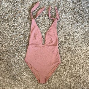 Plunging front and back with tie shoulders. A dusty Pink color with no imperfections!