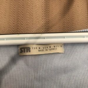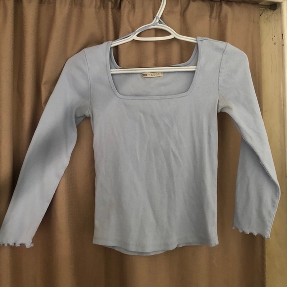 Size medium baby blue with lettuce trim sleeves. Super pretty color on anyone. Only worn twice!