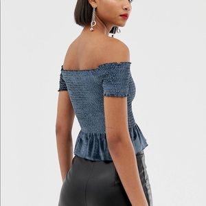 Brand: River Island. Off The Shoulder Velvet Top With Peplum Hem. 92% Polyester, 8% Elastane.