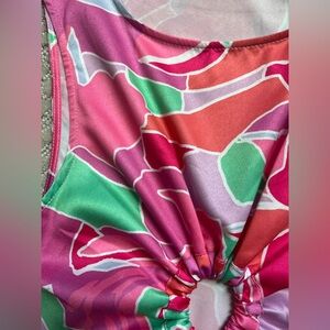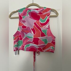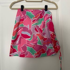 Vibrant two-piece set with abstract print. Features a sleeveless top and matching skirt in a satin material. The skirt has an adjustable tie on the side. Excellent condition- only worn once.
