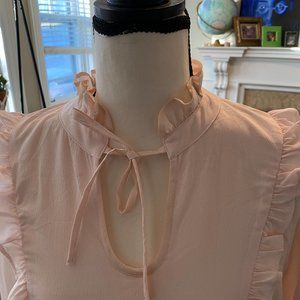 This is a sweet, feminine dress that looks great with a cardigan and heels or a jean jacket and boots. It's got a high neck with a tie and a set of ruffles down the front and a free waist. Women's size large.