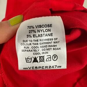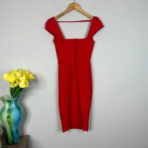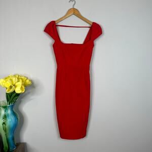 ASOS Vesper Bodycon Red Midi Dress. Excellent gently used condition. Cap sleeves. Back zippers. Stretchy material. Unlined. Square neck. Puff sleeves. Cut-out back, o24