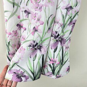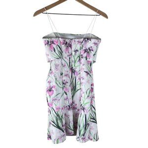 ASOS White Floral Printed Bust Overlay Scuba Mini Dress. White with purple green floral print. Square neck. Spaghetti straps. Flared peplum hem. Stretch scuba material. Back zip closure. Bridal shower, bride, wedding. Polyester elastane blend. Size 4. Armpit to armpit: 14.5". Length: 31.5". (454)