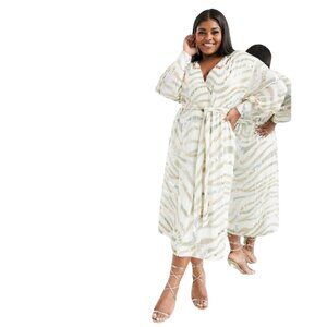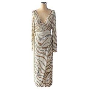 ASOS White, Gold, Silver Long Sleeve Sequin Zebra Print Wrap Midi Dress Size 6