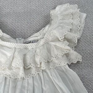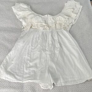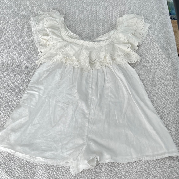 NWOT white jumpsuit with lace ruffle details. Short sleeves. Perfect for summer.