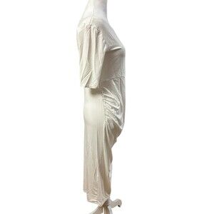 The ASOS White Midi Ruched Dress is a stylish and versatile piece for any woman's wardrobe. Made from a blend of spandex and viscose, this dress features a flattering boat neck and ruched detailing for a touch of elegance. The short sleeve design and pullover closure make it easy to wear, while the solid white color and midi length add a classic sophistication. Perfect for various occasions, this sheath dress from ASOS is a timeless choice that is sure to make a statement.