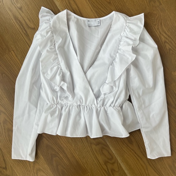 Elegant white blouse with ruffle details. Long sleeves and v-neck design. Perfect for any occasion.