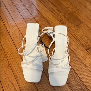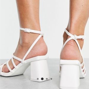 Elegant white strappy sandals. Features block heel design. Perfect for any occasion.
