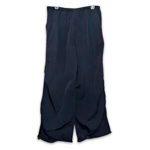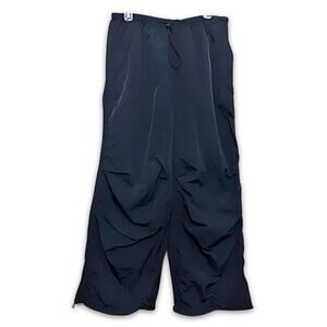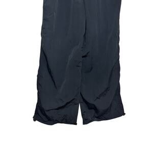 These chic Asos wide-leg pants feature a sleek black design with a high-rise fit, perfect for elevating your wardrobe. This is stylish and functional, offers a bungee cord detail for a customizable look. Ideal for casual outings or a sophisticated athleisure vibe.