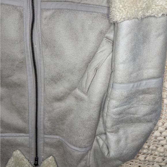 Stay warm and stylish with this cream shearling jacket. Perfect for any occasion, it offers both comfort and elegance some small peeling see pictures.