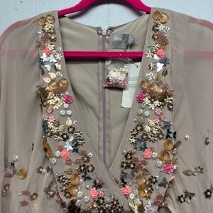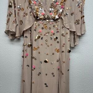 Asos women's dress in tan. V-neck. Wide sleeves. High waisted. Long slits. Lined except sleeves. Maxi length. Beautiful beaded details. In good used condition. No stains, tears or holes.