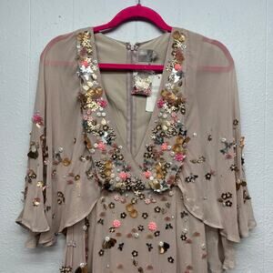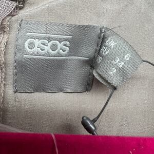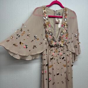 Asos women's dress in tan. V-neck. Wide sleeves. High waisted. Long slits. Lined except sleeves. Maxi length. Beautiful beaded details. In good used condition. No stains, tears or holes.
