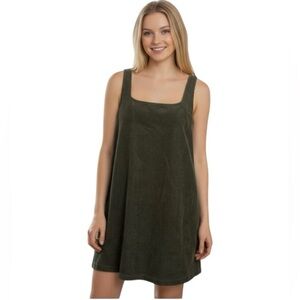 This dress is a mini-length, sleeveless design with a square neckline and an A-line silhouette. The dress is made of corduroy.