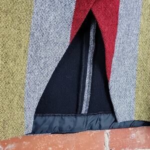 This full length skirt from Asos is perfect for cooler weather. Contructed from a blended fabric that includes cotton and wool. It's weaved to give a tweed-like appearance with a fleecy interior. Features vertical stripes in fall colors. Wrap-style with an inner waist button and a front snap closure. An open slit at the bottom hem finishes the look. Pre-owned, in good condition with a flaw: a tiny hole caused by stretched threads is on the front, near the waist, and goes nearly undetected. We recommend laundering this item before use to eliminate any possible dirt, debris or odors that are common in thrifted garments. In women's size 12.