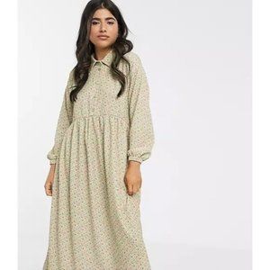 ASOS Womens long sleeve smock shirt dress 14 green ditsy Floral Maxi Cottagecore