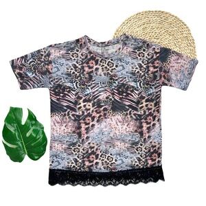 This top brings some major throwbacks to the Y2k & 90’s era with the wild blended animal print through out and the eyelash lace trim on the bottom hem
