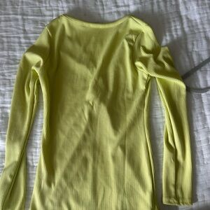 Bright yellow ribbed shirt with button closure. Stylish and versatile for any occasion.