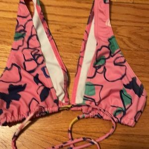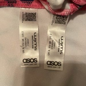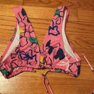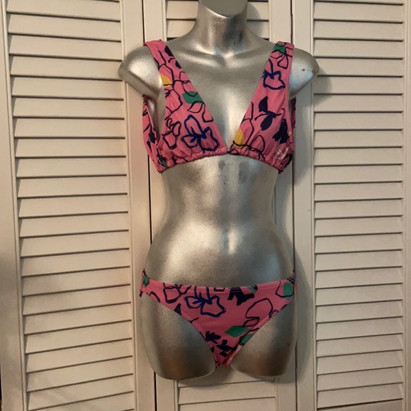 Pink floral 2 piece bathing suit. Moderate back coverage.