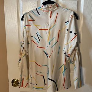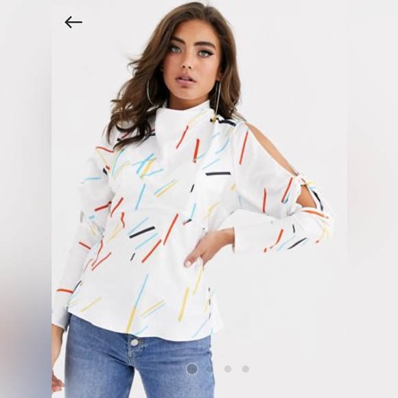 Multi color cowl neck blouse from asos! Abstract lines throughout. Base color is white, lines are red, blue, black and yellow. So cute just too small for me now! Zips up in the back and has a small hook at the top of the zipper. Knot detailing on the arms. Modest cut out outs along the arms. Great condition!