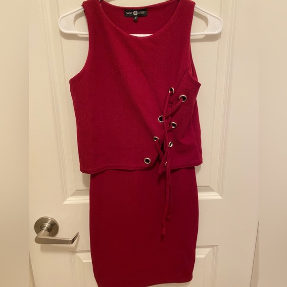Mini dress with lace details. The material is soft knit. Only worn twice. The length for me (5’4) is above knees.