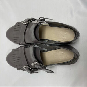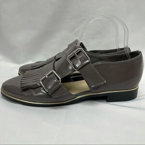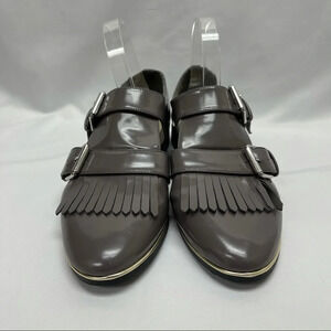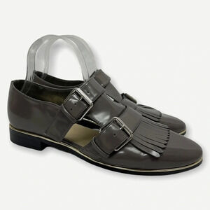 Front fringe, double buckle, silver accents, cutout sides, short heel, minor scuffing