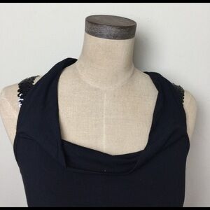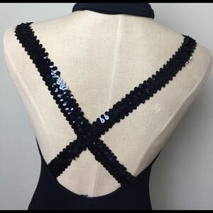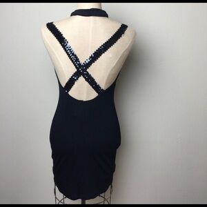 Fabulous body con stretch halter dress with sequin cross back straps. Pullover styling