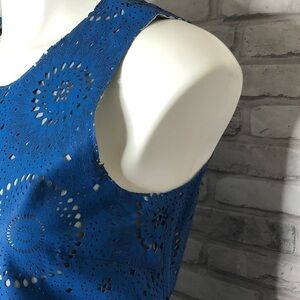 ASOS mini dress Gray with blue overlay with cutouts Sleeveless Rounded neckline Zip up back Size: 6 100% leather, lining: 100% acetate Approximate measurements Pit to pit: 17” Length: 32” Smoke and pet free home