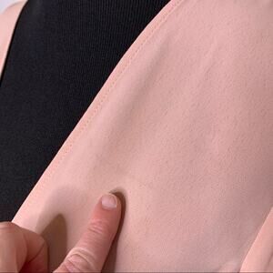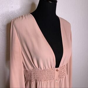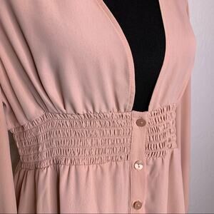ASOS light pink elastic waist button front dress. Deep v neckline. Wide elastic waistband. Elastic ruffle sleeve cuffs. Button front. Size 10. Excellent preowned conditon. One tiny mark on back neckline and on front as shown. 100% polyester. Machine wash.