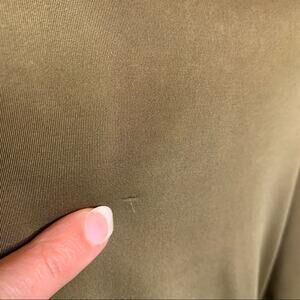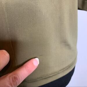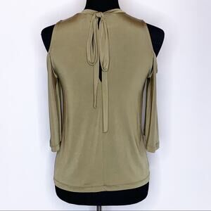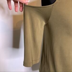 ASOS olive green tan cold shoulder top. Pullover style with high neckline. Cold shoulder style with midlength sleeves. Keyhole opening and tie at back neckline. Size 0. Excellent preowned conditon. A couple of tiny snags as shown. Polyester elastane blend. Machine wash.