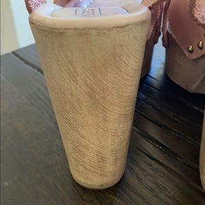 In very good used condition. Some small stains in the front of both shoes but not noticeable when you have them on but it is part of the normal wear. Used a handful of times. The heel and sole bottom are in great condition. The color is like a pale salmon. The shoes are marked size 7 but run small as they fit more like 6or 6 1/2.