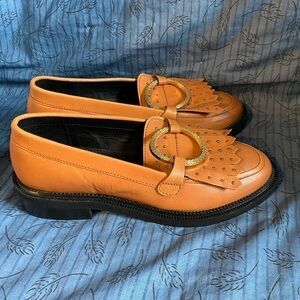 ASOS ring kiltie style loafer. Gold ring over studded kiltie fringe, Terra cotta color US size 5