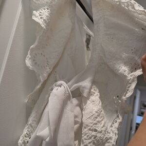This adorable shirt has not been worn, however it has been washed once and one of the tips of one ribbon has a tiny mark at the end that can probably be washed out.