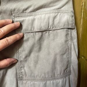 ASOS size 6 made in Turkey 100% cotton drawstring waist joggers.two front snap pockets and a snap zipper fly and drawstring at top. Drawstrings at ankles as well. One back pocket . The colored is a washed out marbled grey. Top of pants side to side 14.5”, rise 12”( high rise) and inseam 30”. Oversized legs - athleisure