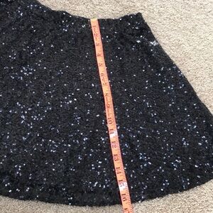 ASOS size 8 Black mini Sequined skirt with elasticized waist. Fully lined. Gently used. Runs small, measurements in pictures for reference.