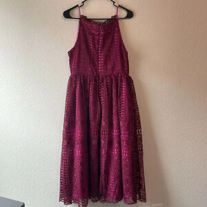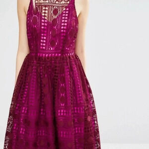 Gorgeous fit and flare ASOS size 8 purple egg plant crochet with hot pink liner. The dress has 4 layers - crochet lace, pink liner, pink tulle, pink liner. So it has some weight to it. Perfect for a wedding, prom, or event. So pretty.