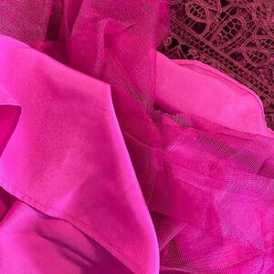Gorgeous fit and flare ASOS size 8 purple egg plant crochet with hot pink liner. The dress has 4 layers - crochet lace, pink liner, pink tulle, pink liner. So it has some weight to it. Perfect for a wedding, prom, or event. So pretty.