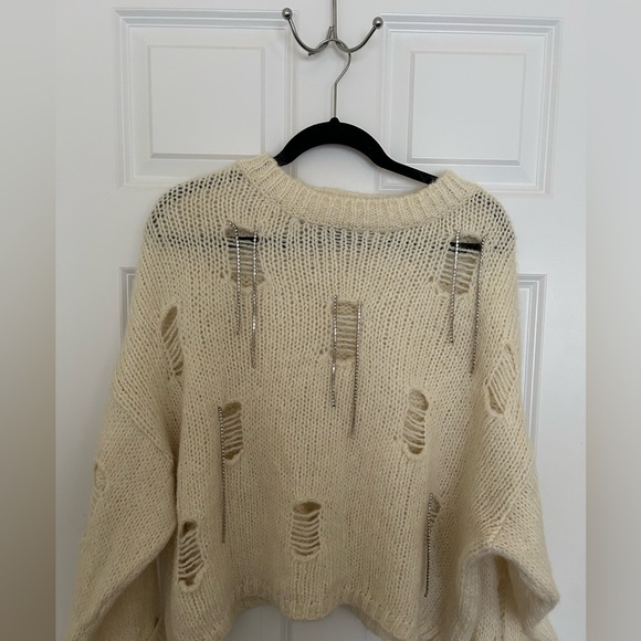 ASOS sweater • size US14 • cream color • distressed design w/ cute dangly crystals!!! so cute, i just don’t wear it anymore :)