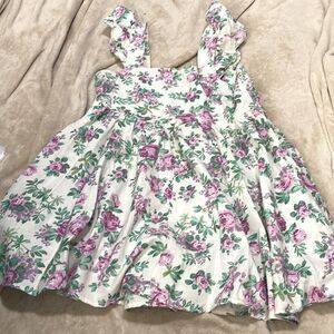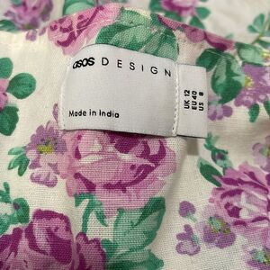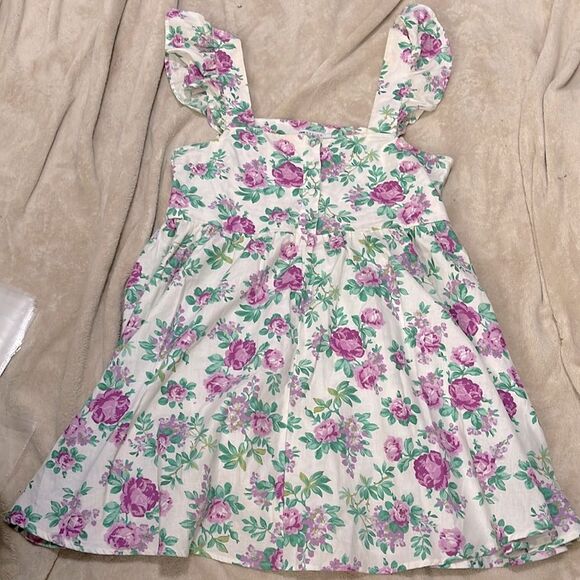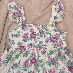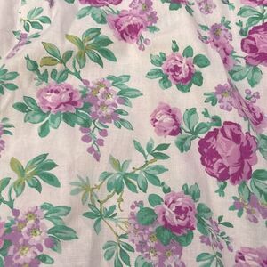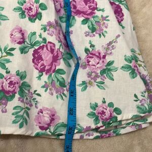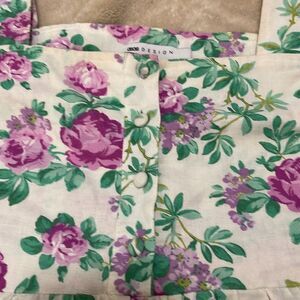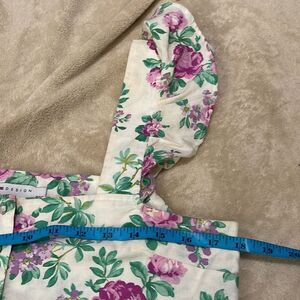 Floral print, flutter sleeves, front middle buttons, unlined, material tag cut feels like a linen blend. Minimal signs of wear