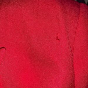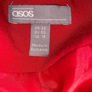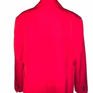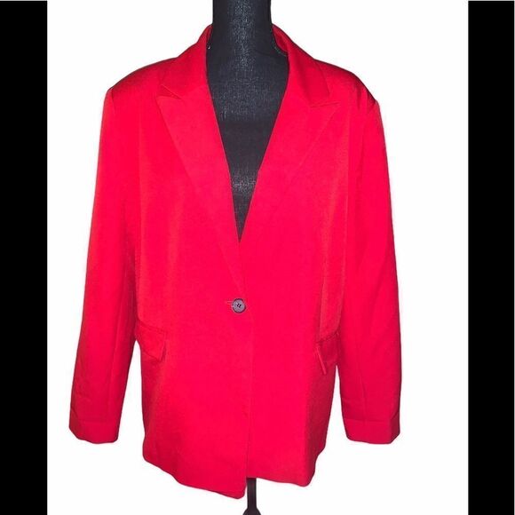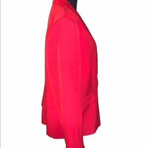 Red one button closure blazer. Long sleeve. Waist pockets with flaps. Three button design on sleeve hem. Fully lined. Main: 87% polyester/13% elastane. Lining: 100% polyester. Size: 18. Preowned in good condition. Small snags on upper blazer (as shown in pictures).