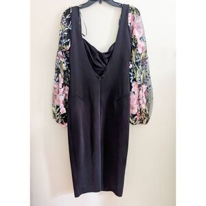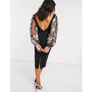 ASOS Design Embroidered Floral Mesh Puff Sleeve Cupped Midi Pencil Dress in black. Sweetheart neck and low back. Slit in the back for easier movement.