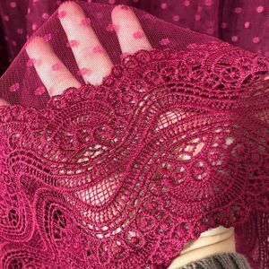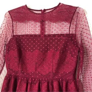 This dress is a size 10 has long mess sleeves with dots mesh underlying with crocheted detailing has a lining is 100% polyester with zipper on the back