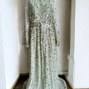 ASOS Design Maxi Anarkali Dress In Scatter Sequin In Soft Green, Size 14, Pit~Pit 22”, Waist 18”, Length 62”, Sold Out Piece, Brand New With Tags!
