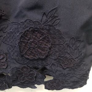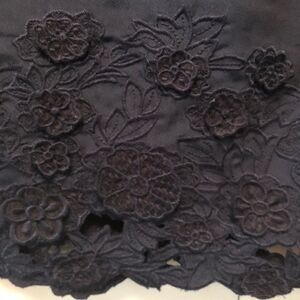 This dress is in excellent pre-owned condition. It is lightweight, and has lace and appliquéd flowers around the bottom and at the end of the 3/4 length sleeves. The flowers add 3D texture to the dress and are so cute!