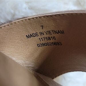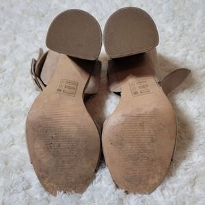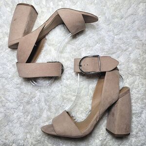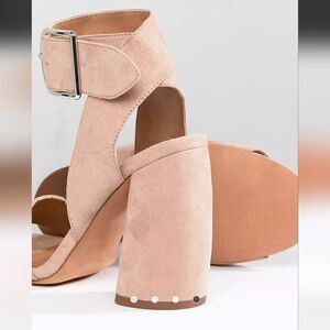 These are adorable ASOS, Nude, faux suede, chunky heels that feature a big buckle ankle strap that elegantly twists around the leg:) These heels are in great used condition with only some minor signs of wear on the soles as shown in the photo. Faux Suede is in great conditon and any discoloration in photos is from the direction the suede is brushed - no stains 😊 The color of these heels is also more of a blush/nude color. So they do have a little blush tint in them:)
